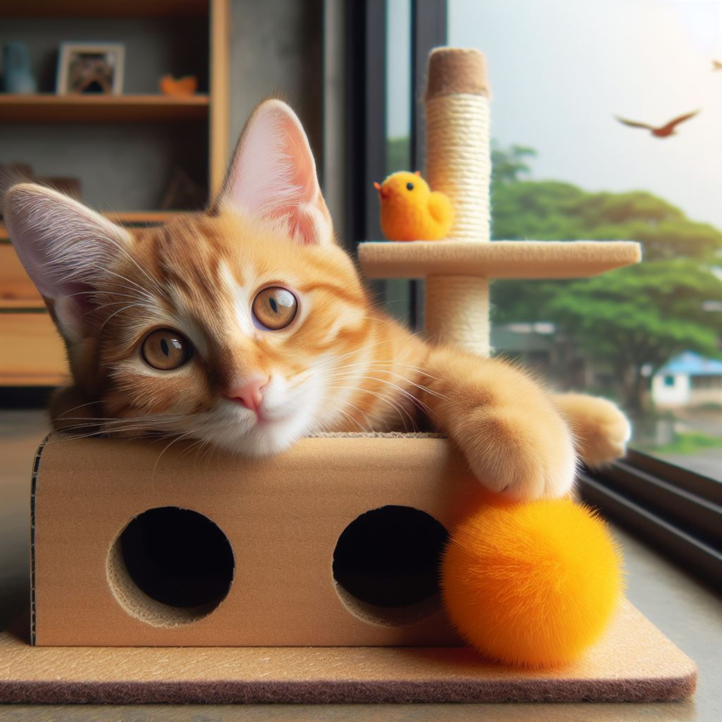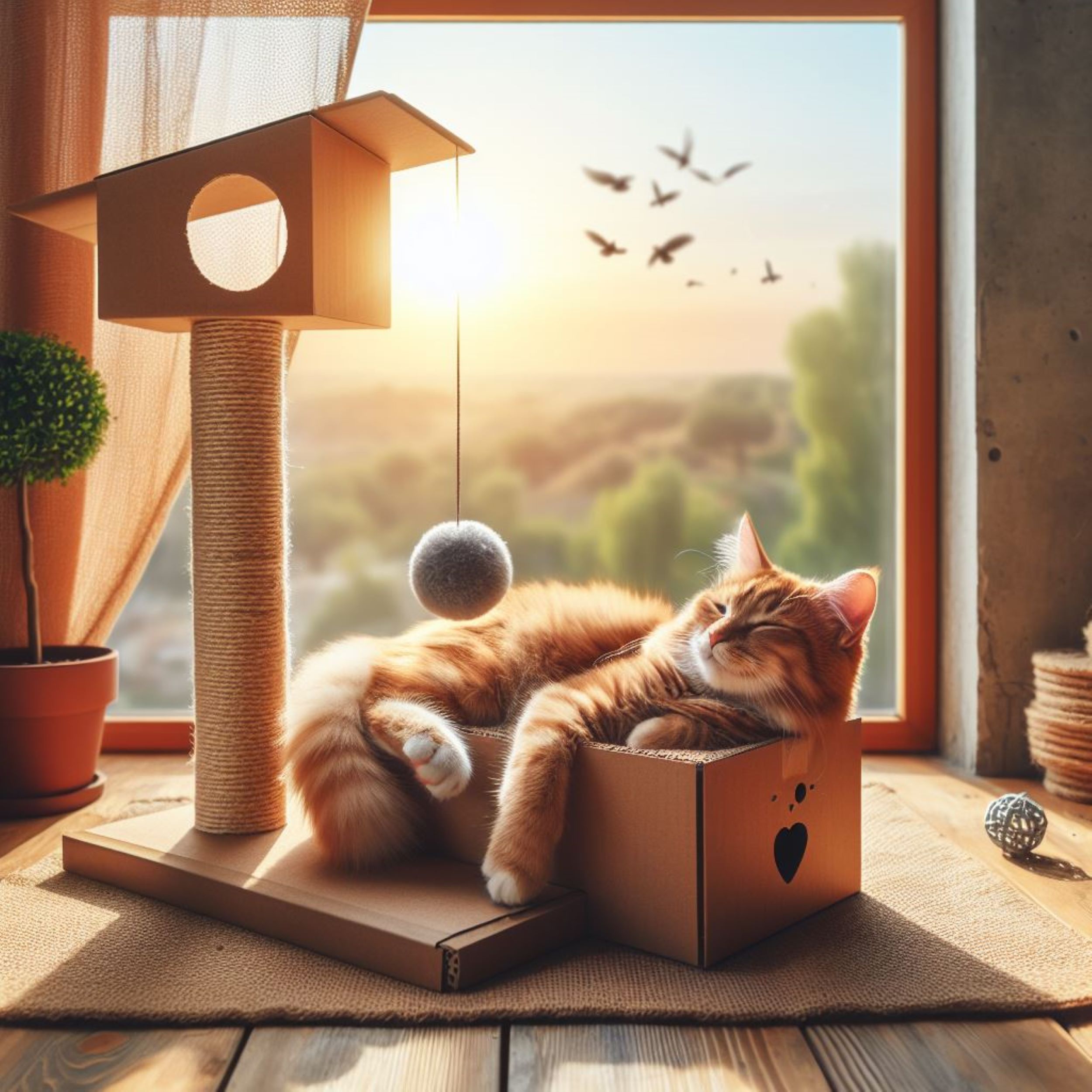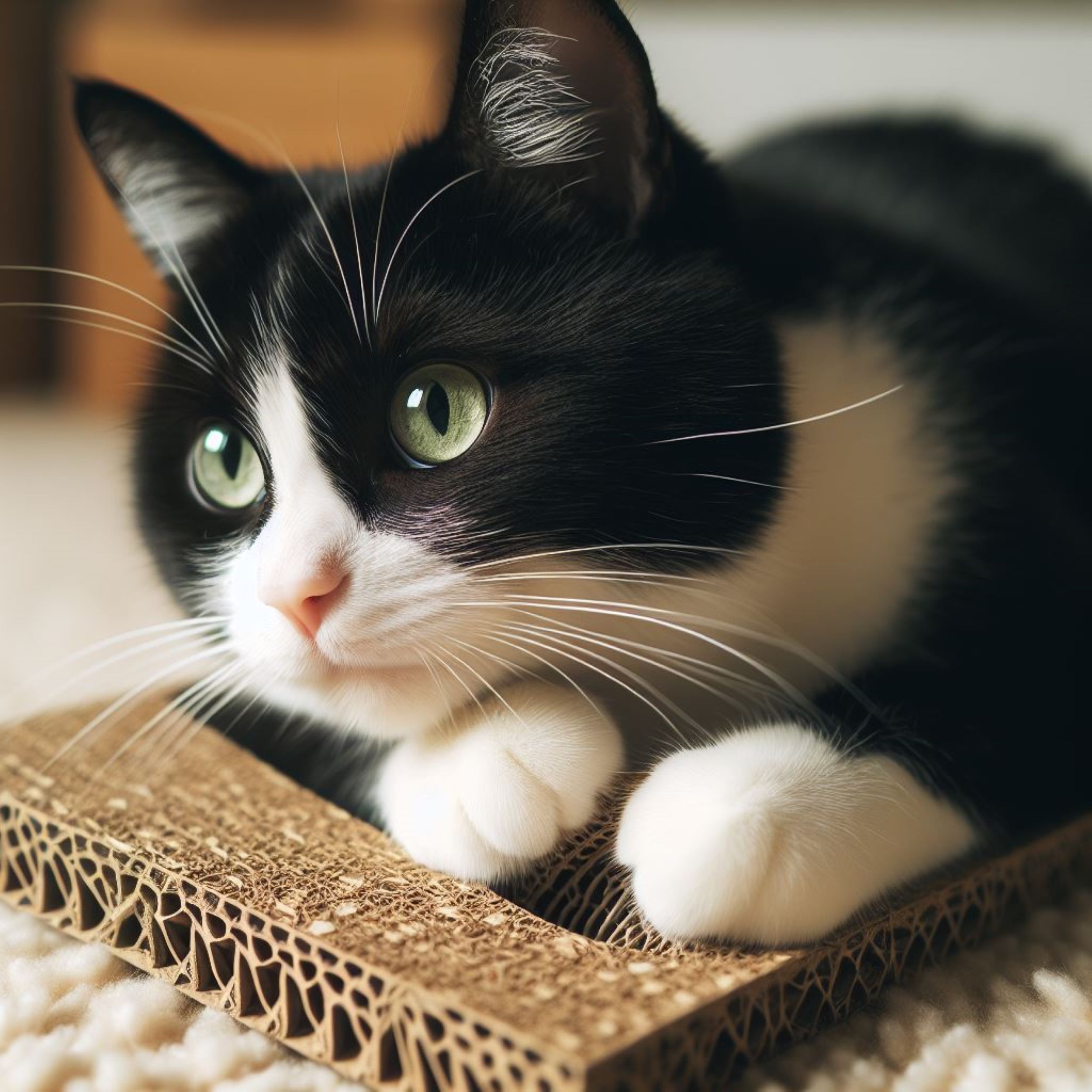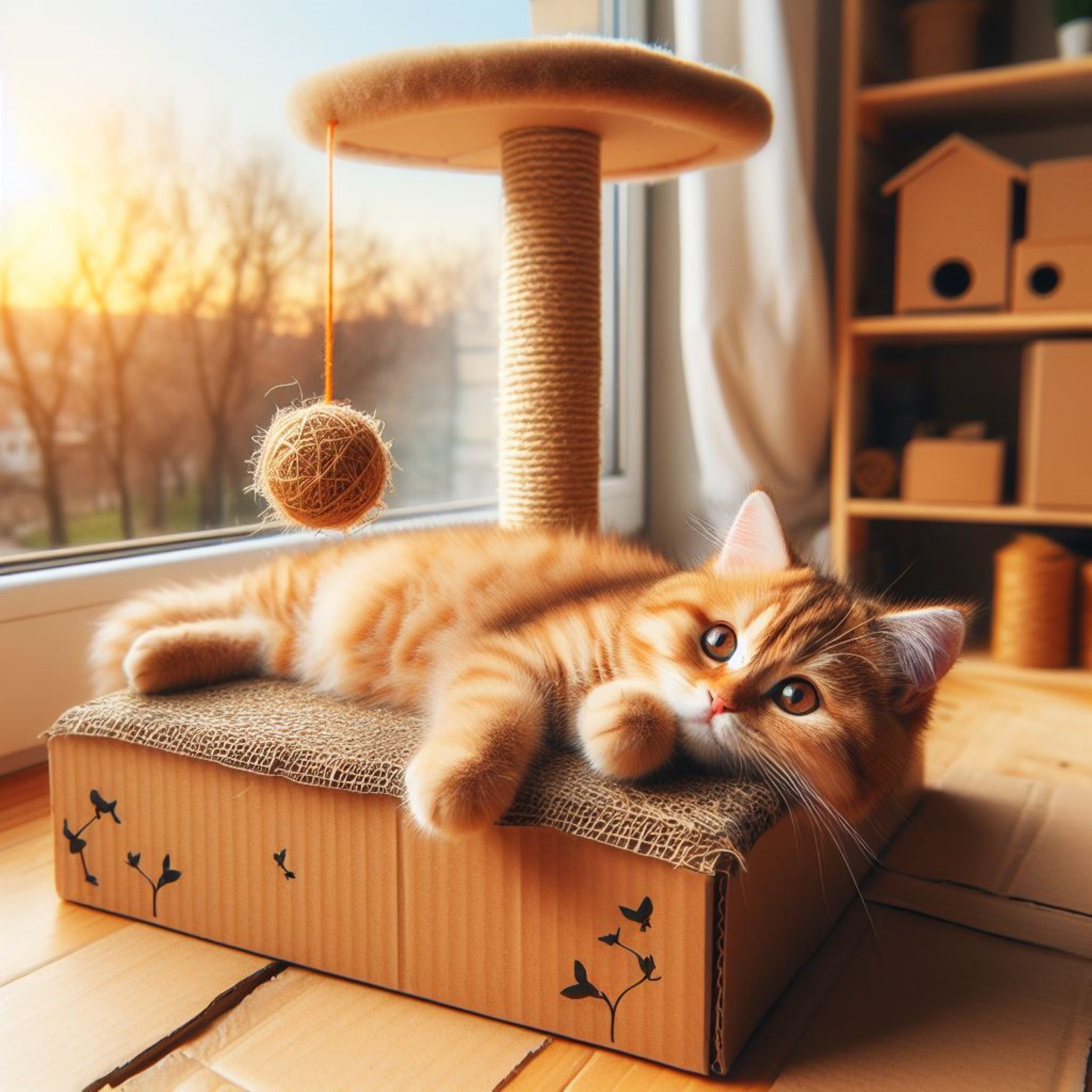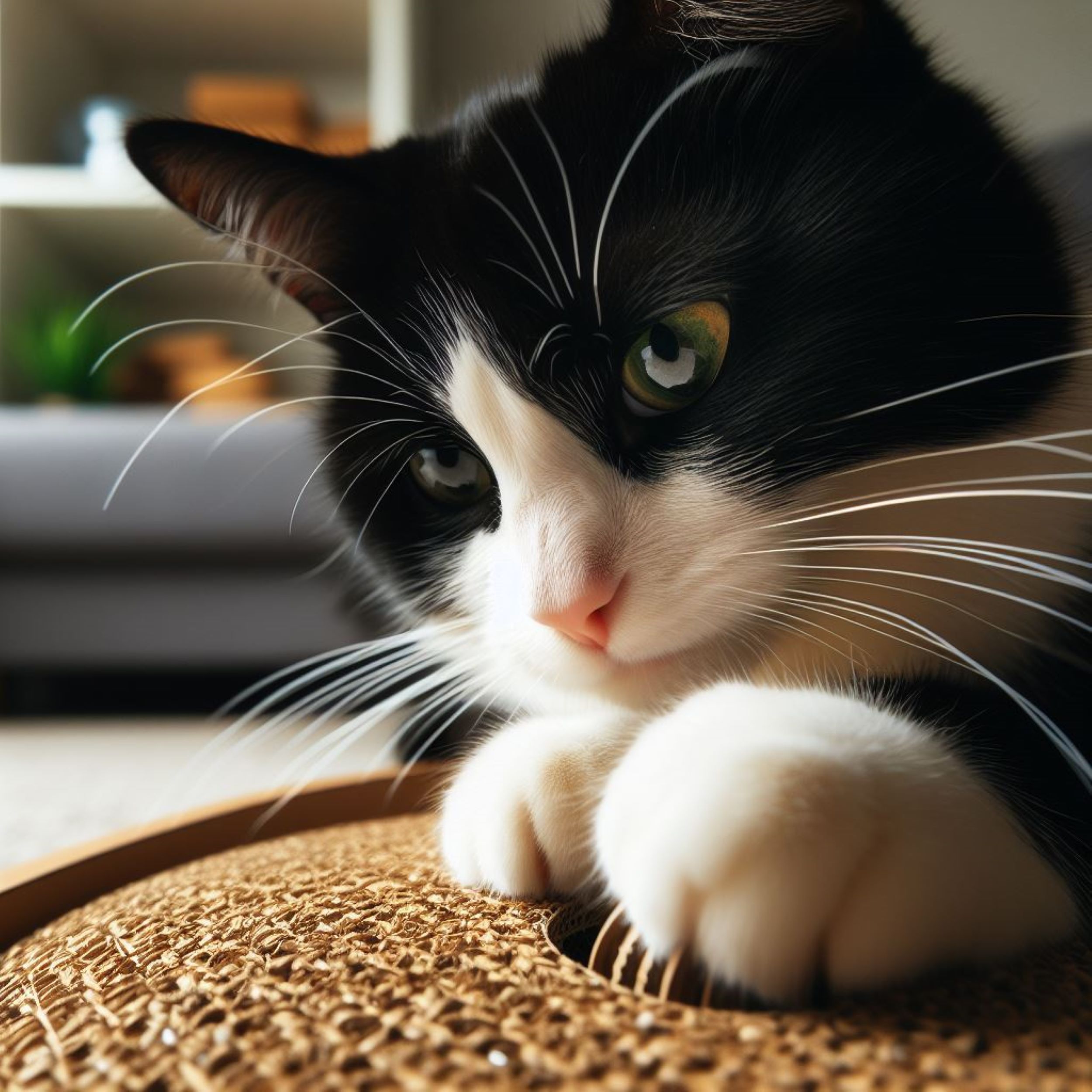 고양이는 스크래쳐 주변에서 놀며 활발하게 움직이는데, 이는 그들의 건강과 행복에 도움이 됩니다.